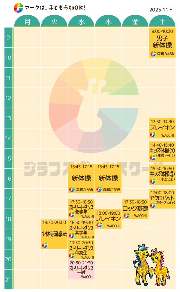 新体操のクラスでは、マット運動、柔軟やダンスで身体の基礎を作り育てて、 手具(しゅぐ/ボール、リボンなど)と親しみながら器用さも身に付けていきます。